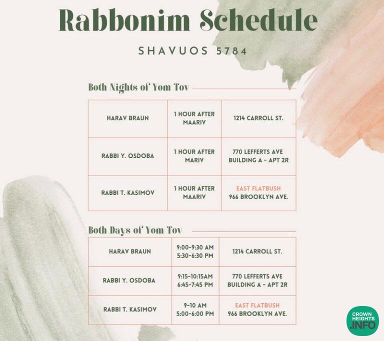 To assist those in Crown Heights who may need to ask a question of a Rov over Shavuos, the Rabbonim’s schedule has been released for the benefit of the public.