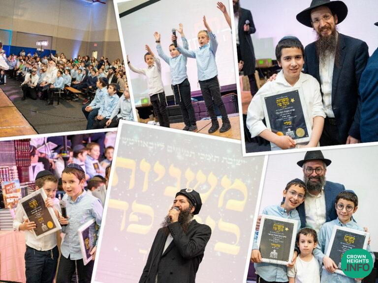 A total of 160 students proudly sat on the bleachers in the new gym, celebrating their achievements in learning lines, Prokim and Mesechtos of Mishnayos and Tanya B’al Peh.