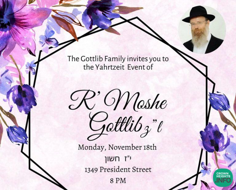 The Gottlieb Family invites the Crown Heights community to join them for a Yartzeit event memorializing R’ Moshe Gottlieb OBM. The event will take place in Crown Heights on Monday, November 18th, at 8:00pm.