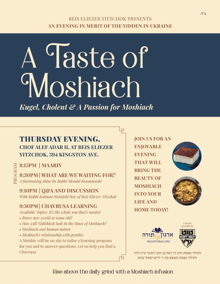 Thursday: Kugel, Cholent, And A Taste Of Moshiach In Crown Heights Posted to Community Events on March 23, 2022