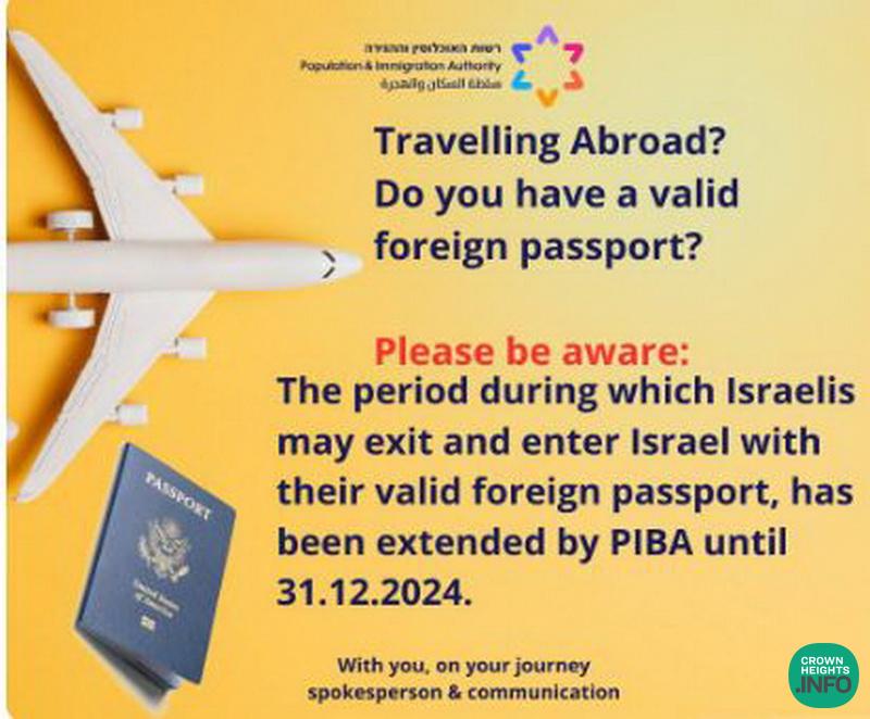 We are now pleased to share that the Population Authority has announced that the allowance will be extended for another year, until December 31, 2024. Israelis with dual citizenship will be able to enter and exit Israel even if they have not managed renew their Israeli passports, by presenting their foreign passports.