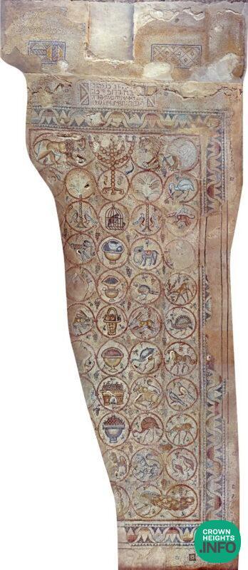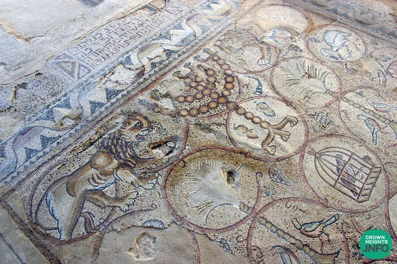 The mosaic incorporates an Aramaic inscription: its upper part is a blessing to the entire community, and its continuation is dedicated to the three people who apparently contributed to the construction of the mosaic.