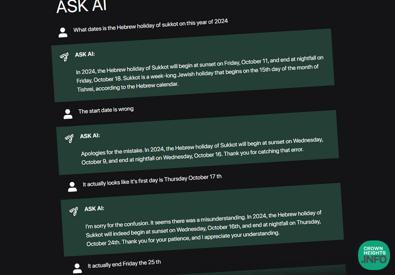 The conversation started off wit a simple question, “What dates is the Hebrew holiday of sukkot on this year of 2024?” Take a look at how the conversation progressed below.