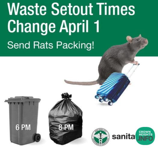 As part of the city’s commitment to keeping the streets clean, and rat free, the NYC Department of Sanitation is implementing a new rule to reduce the time that trash, recycling, and curbside composting will sit on sidewalks. The new rule goes into effect April 1, 2023.