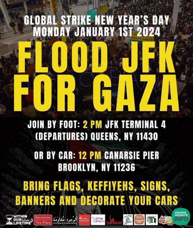 The strike, undersigned by eleven pro-Palestinian organizations, calls for their supporters to flood the departures area of JFK in vehicles and on foot in protest of the ongoing war. The vehicle caravan is called to congregate at Canarsie Pier at 12:00pm before traveling on to JFK.
