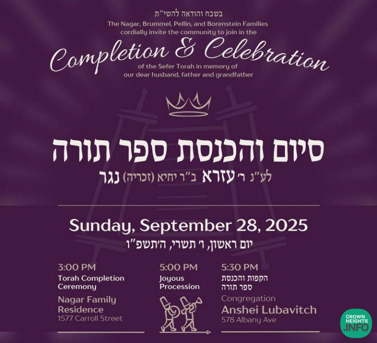 The Nagar family warmly invites the Crown Heights community and friends to join them for a Siyum and Hachnasas Sefer Torah in loving memory of their beloved husband, father; grandfather, source of light and inspiration, R’ Ezra ben R’ Yichye Nagar, ע”ה.