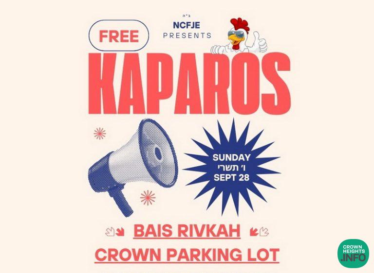 Free chickens for kaparos will be distributed this Sunday, 6 Tishrei, September 28 from 12:00 PM to 6:00 PM at the parking lot of Beis Rivkah Crown St. This offering is exclusively available to residents of Crown Heights, East Flatbush and Remsen Village, and only at the Beis Rivkah location.