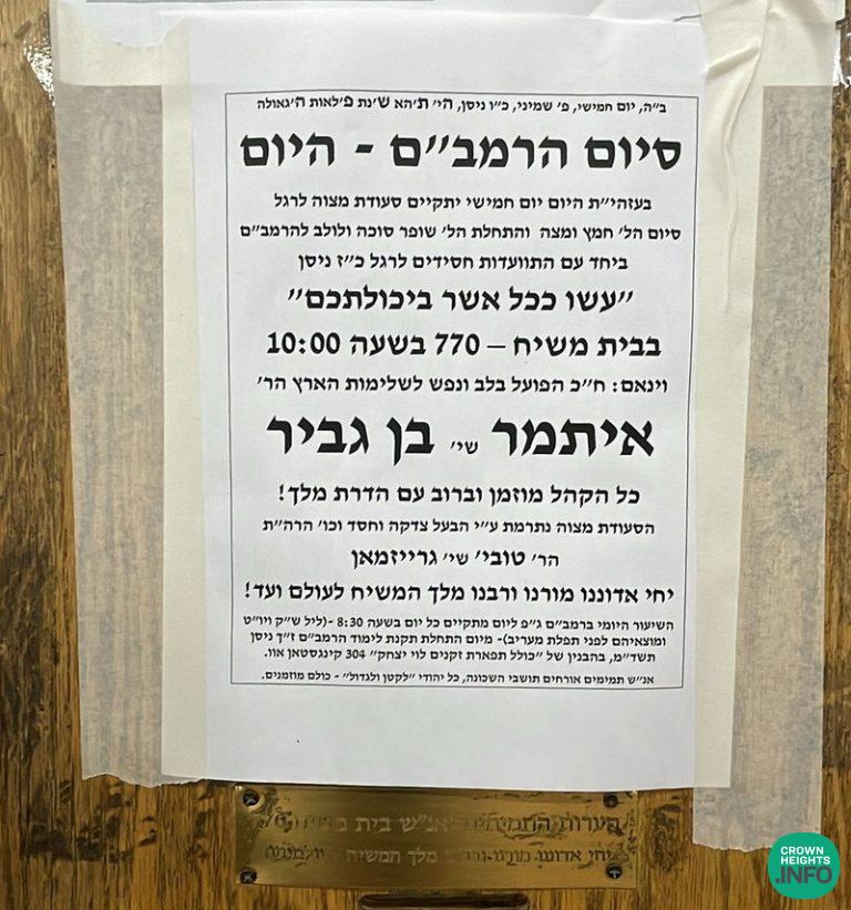 Itamar Ben-Gvir, one of Israel’s hard right ministers, is on a visit to the United States and will allegedly be making a stop at 770 Eastern Parkway. This sign advertising his presence at a Siyum Harambam was hung in 770.