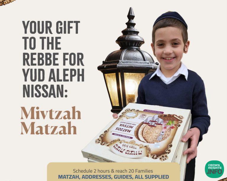 A large-scale Mivtza Matzah campaign is currently underway to distribute thousands of Matzahs to Yidden across Brooklyn, offering Crown Heights families the opportunity to participate in the Rebbe’s Mivtza – an especially meaningful gift for Yud Aleph Nissan.