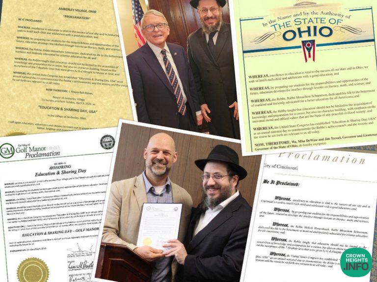 As the world prepares for 11 Nissan, Rabbi Gershon Avtzon – of Yeshivas Lubavitch Cincinnati – arranged for the Ohio Governor – Mr. Mike Dewine – to proclaim 11 Nissan as Education Day in the state of Ohio. The Governor was joined by the Mayors of Cincinnati, Amberley Village and Golf Manor.