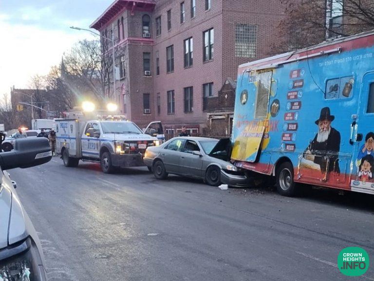 A Mitzvah Tank, operated by Rabbi Yehuda Pevzner, was parked on a Crown Heights street when a driver fell asleep behind the wheel and crashed into it around 7:10am.