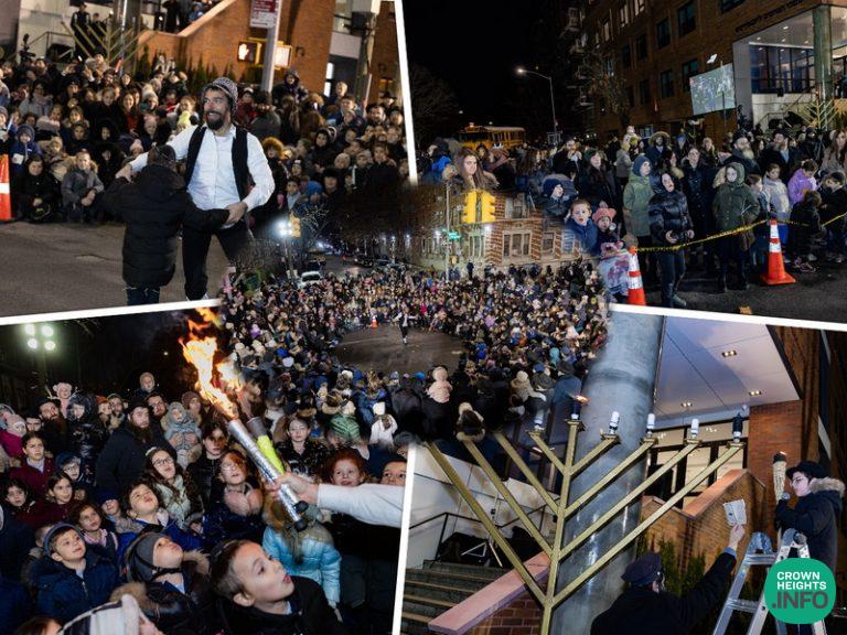 On Wednesday night, the first night of Chanukah, large crowds gathered outside 570 Tomchei Temimim Way for an incredible Menorah lighting event by United Lubavitcher Yeshiva.