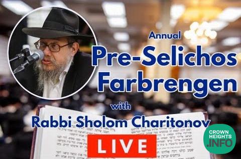 This Motzei Shabbos we begin saying Selichos, and in the custom of Lubavitch, farbrengens will be held leading up to the unique preparation for Roch Hashana. Rabbi Shalom Charitonov will be farbrenging live starting Motzei Shabbos at 10:00pm.