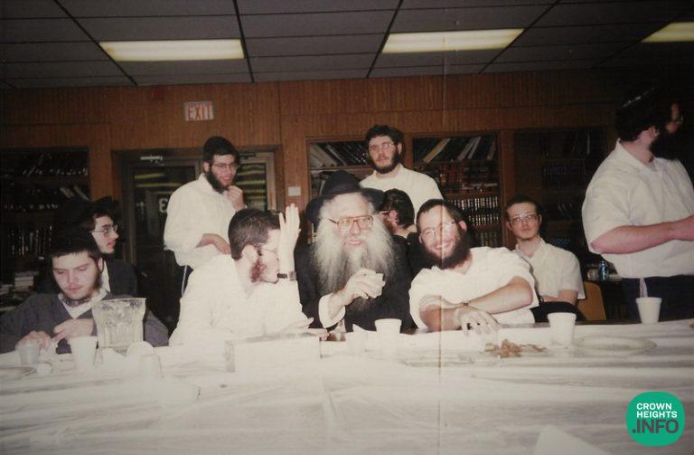 Marking the day of R’ Meilech Zweibel’s Yartzeit, we present a historic photo from 1995 when R’ Binyomin Klein came to farbreng in the Yeshiva in Morristown, NJ. Featured in this photo is R’ Meilech Zweibel, Rabbi Binyomin Klein, Rabbi Elyokim Wolf, Rabbi Moshe Herson, and Rabbi Zalman Wiskansky.