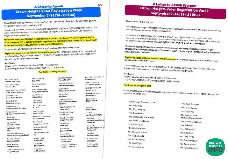 Over 60 local shuls and organizations have signed a joint letter urging all residents to register to vote. In addition, 25 prominent women leaders—including organizational heads, longtime activists, and educators—have issued a letter addressed specifically to women in the community.