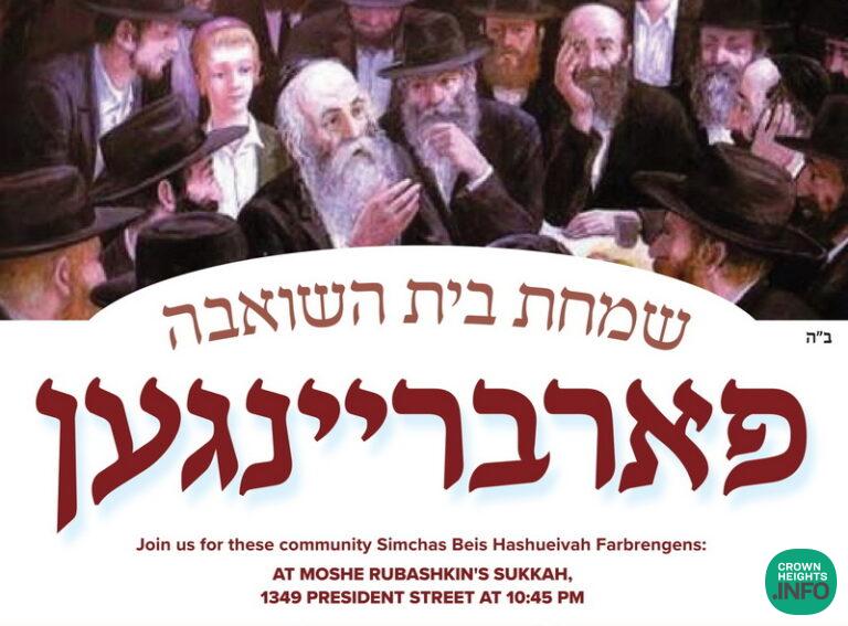 The Crown Heights community is invited to join us for inspiring and uplifting Simchas Beis Hashoeva Farbrengen’s, each night of sukkos.