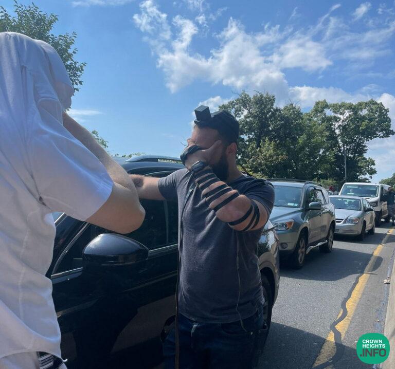 Stuck in standstill traffic on the Jackie Robinson Parkway, a Sofer with a Sefer Torah was heading to a Siyum and Hachnasas Sefer Torah in Fishkill, NY last Sunday. With nothing better to do, he got out of his car and went looking for a fellow Jew to put in Tefillin with. This picture was taken as he put on Tefillin with another driver, putting his shirt over his head so that he could give him his Yarmulka.