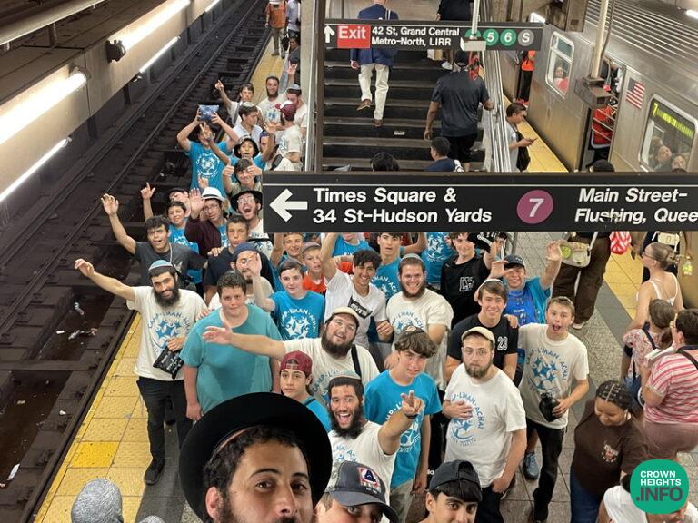 The group spent the night at Oholei Torah sleeping in the dorm, experiencing the life of Yeshiva bochurim. The group then visited Times Square, where they danced on the Big Red Stairs, making a huge kiddush Hashem, and garnering cheers and videos from many onlookers.