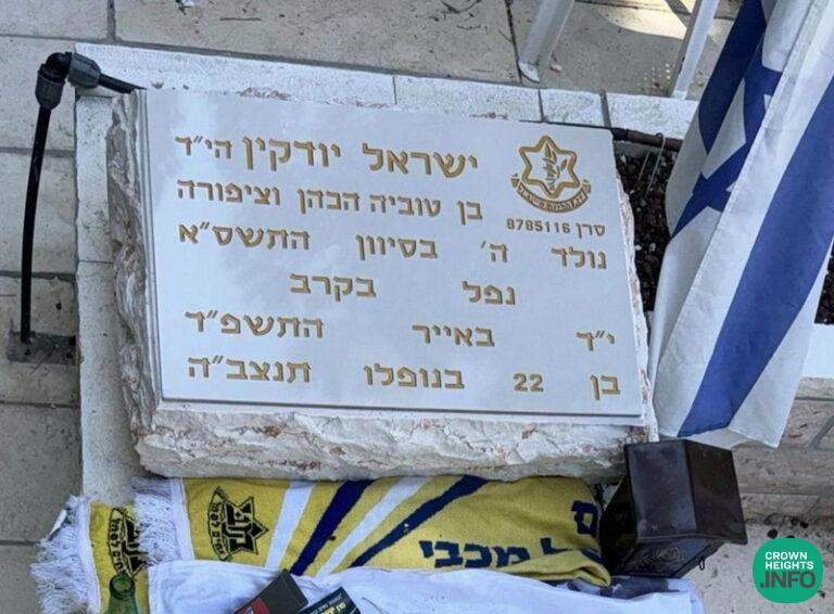Following a reversal of policy by Israel’s Ministry of Defense, the headstone of Yisroel Yudkin HY’D, an officer in the IDF and Chabad Chossid who was killed while fighting in Gaza, was placed with the acronym for Hashem Yakum Damo. This picture was posted to X by Minister Itamar Ben-Gvir.