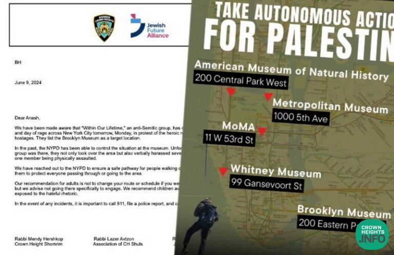 We have been made aware that “Within Our Lifetime,” an anti-Semitic group, has called for a demonstration and day of rage across New York City tomorrow, Monday, in protest of the heroic rescue by the IDF of the hostages. They list the Brooklyn Museum as a target location.