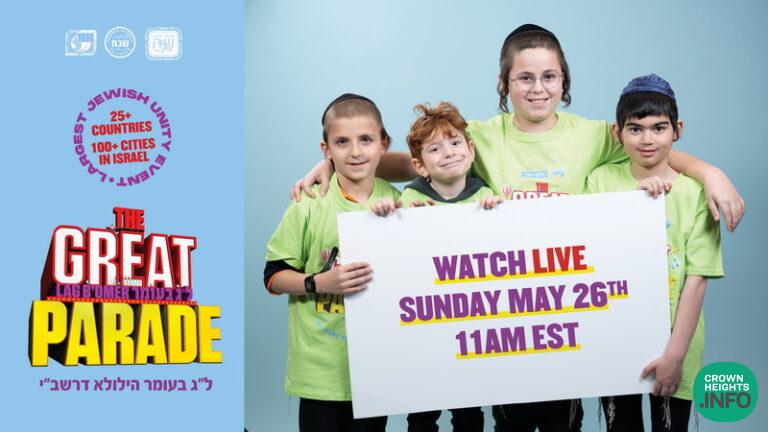 Join tens of thousands of Jewish children as they parade with pride at the Great Parade this Lag B’Omer. Join the LIVE feed at 11:00am here on CrownHeights.info.