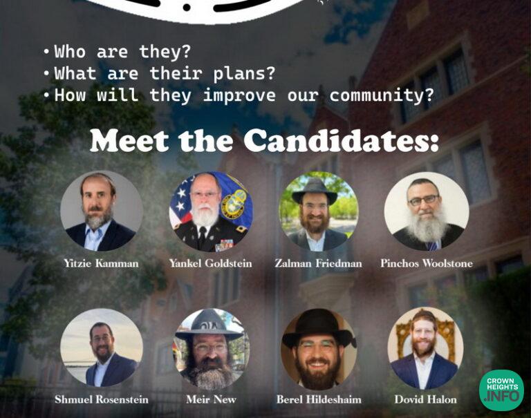 The much anticipated “Meet the Candidates” forum take place tonight Monday, May 20, 8:00pm at Lubavitcher Yeshivah (New Side Hall). The event will be broadcast LIVE as the candidates discuss their platforms and plans if elected to the Crown Heights Vaad Hakohol.