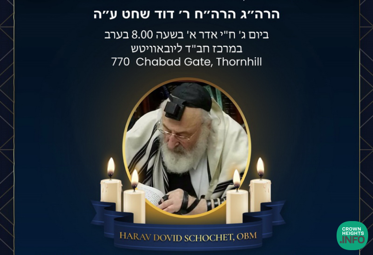 A Shloshim event in memory of Harav Dovid Schochet OBM will be taking place in Toronto on Tuesday, February 27th, at 8:00pm. The event will be broadcast LIVE on Zoom.