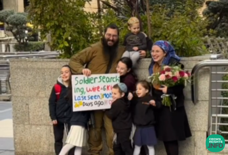 After four long months without their father, six young children from Crown Heights along with their mother arrived in Eretz Yisroel and were reunited as a family. Henoch Junik has been serving with his unit in the IDF since the war began four months ago.
