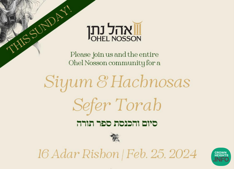 The community is invited to join Ohel Nosson for a Siyum and Hachnasas Sefer Torah taking place Sunday in Crown Heights.