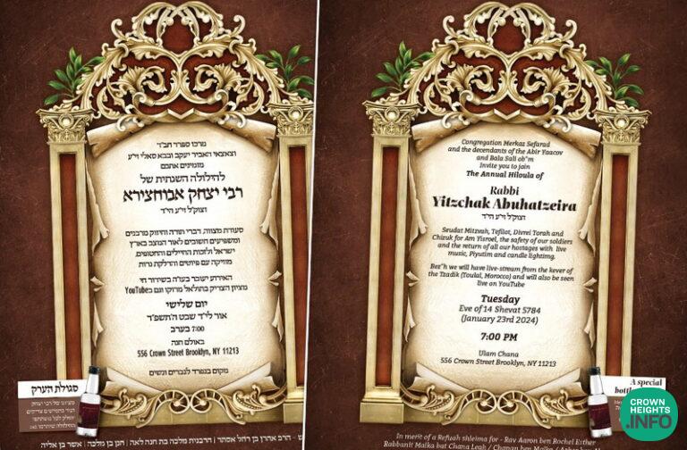 Merkaz Sefarad Chabad in partnership with the Lipsker and Zaets families, (decendants of the Abir Yaacov and the Baba Sali), invite you to join in the annual Hiloula of Rabbi Yitzchak Abuhatzeira this coming Tuesday night, January 23rd.