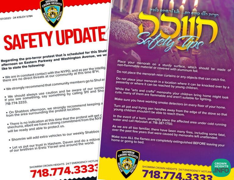 Crown Heights Shomrim has released safety tips for Chanukah as well as a Security Update due to the ongoing tensions in Israel.