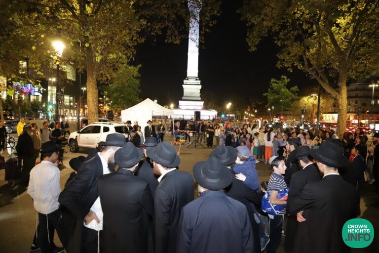 Over a hundreds men, woman, and children congregated in Bastille Square in Paris for a Simchas Bais Hashoeva event complete with music, stuntman, and dancing.