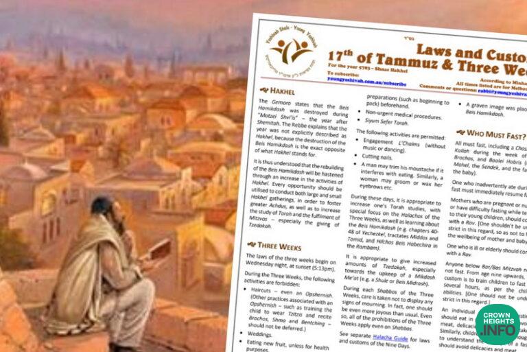 Rabbi Shmuel Lesches, Magid Shiur in the Yeshiva Gedola of Melbourne, Australia, has compiled a guide to the laws and customs of the fast of the 17th of Tammuz and the three weeks for the benefit of the wider Lubavitch community.