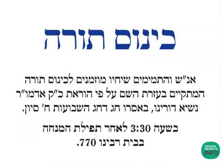 The annual Kinus Torah will be taking place in 770 on Tuesday, Isru Chad Shavuos, as was requested by the Rebbe. The Kinus will feature Rosh Yeshivos and Rabbonim including the Rosh Yeshiva of 770 Rabbi Schneur Zalman Labkowsky.