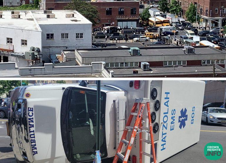 Two Hatzalah volunteers miraculously walked out with only minor injuries after the ambulance they were driving to an emergency overturned.