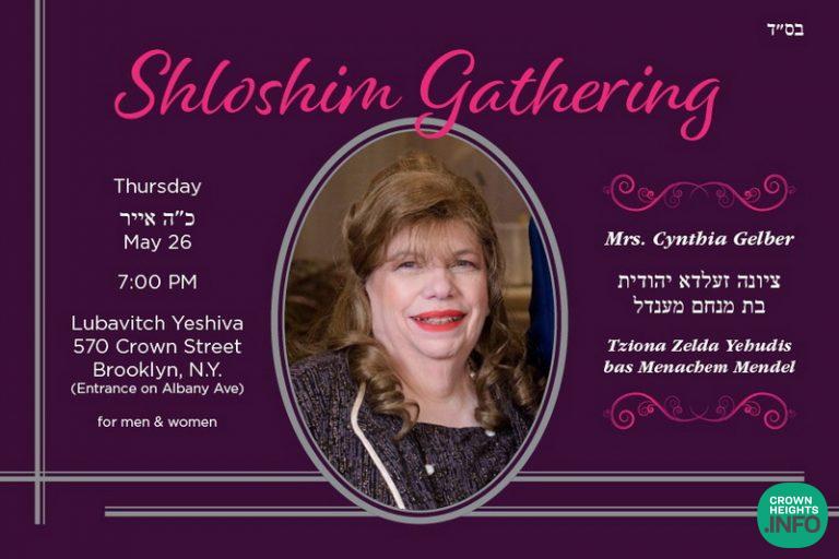 An event will be taking place this Thursday for the Shloshim of Mrs. Cynthia Gelber OBM, best known for working in Dr. Feldman’s office in Crown Heights for many years.
