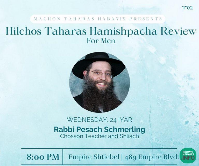 Join Rabbi Pesach Schmerling, a Chosson Teacher and Shliach tonight, for a Review of Taharas Hamishpacha for Men on the Topic of Harchakos.”