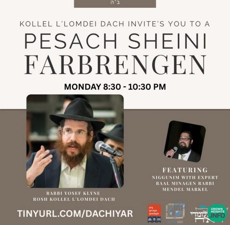The farbrengen will be led by the Rosh Kollel of Kollel L’lomdei Dach Rabbi Yosef Klyen. It will be accompanied by expert baal minagin Rabbi Mendel Markel.