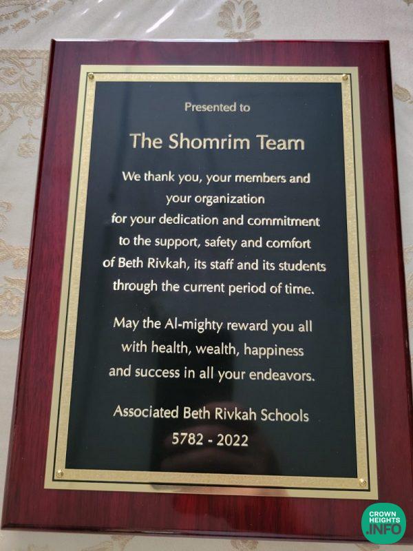 The coordinators of Shomrim then received an award on behalf of the entire organization from Associated Beth Rivkah Schools for the volunteers dedication, commitment and support presented by the schools director Rabbi Shalom Goldstein.