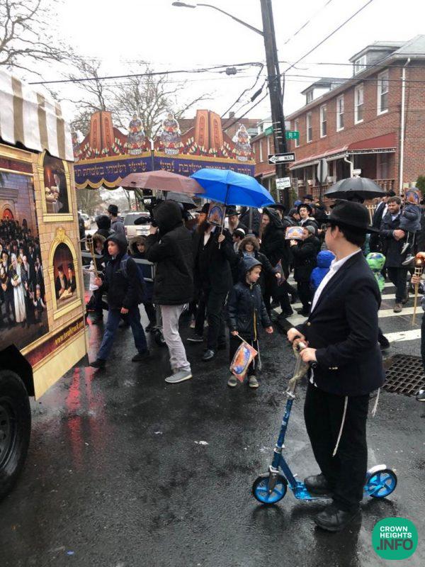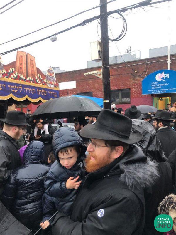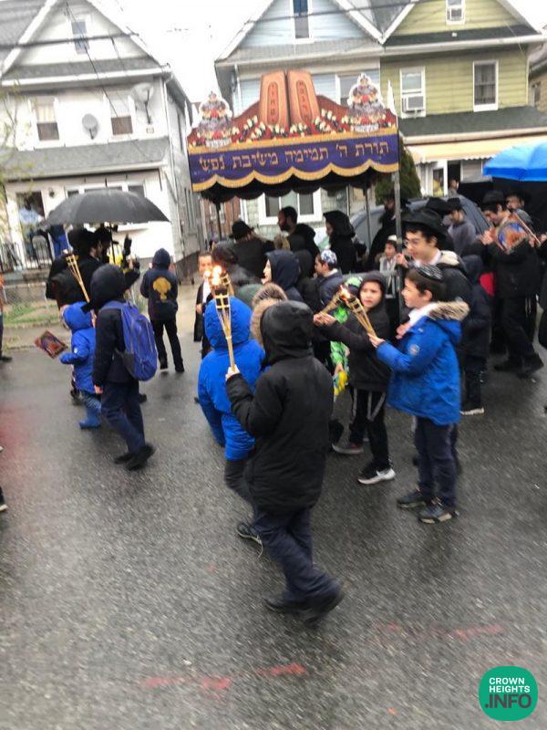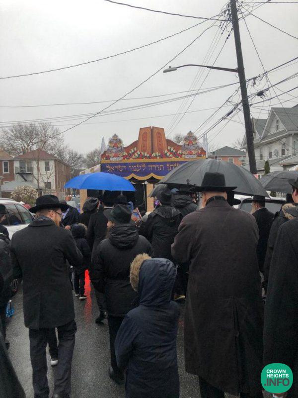 The procession marched, danced, and sang through the rain and down the wide street of Remsen Ave, accompanying the Torah to its new home at Lubavitch of Remsen Village.