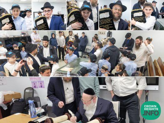 On a recent Thursday morning the boys in Rabbi Samuels’ 4th grade class at Darchai Menachem in Crown Heights had a unique opportunity to get up-close and participate in their own Hachnosas Sefer Torah. The ksiva of the newly refurbished Torah was finished in their classroom after which the boys escorted the Torah to the Yeshiva’s shul for some lively dancing.