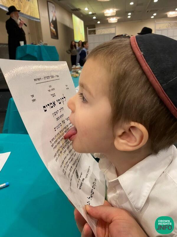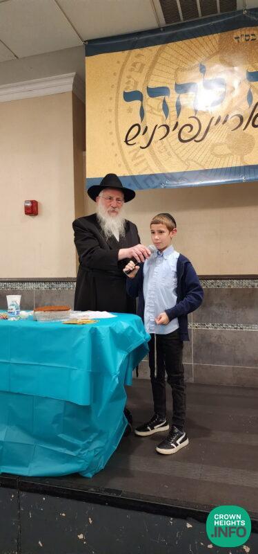 Each child was presented with his own inscribed honey cake, an egg with special pesukim, and the Sha’ar Blatt of Tanya with honey. An interactive slideshow helped the children find each letter of the Aleph Beis in their page of Tanya. The boys licked the honey from the letters, introducing them to the sweetness of Torah. The children were told that Malach Michoel threw candies, and then each boy got to eat his delicious honey cake and egg.