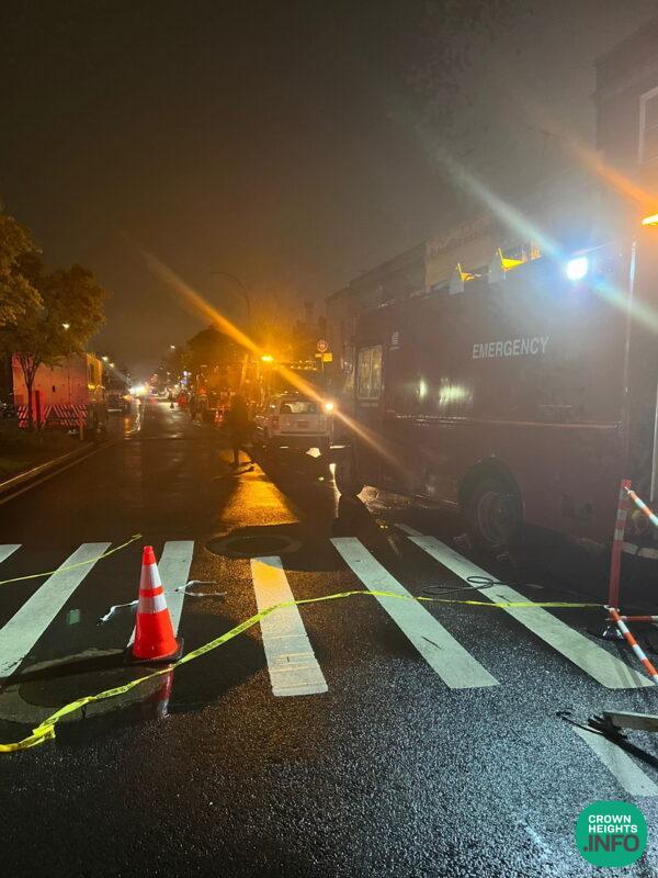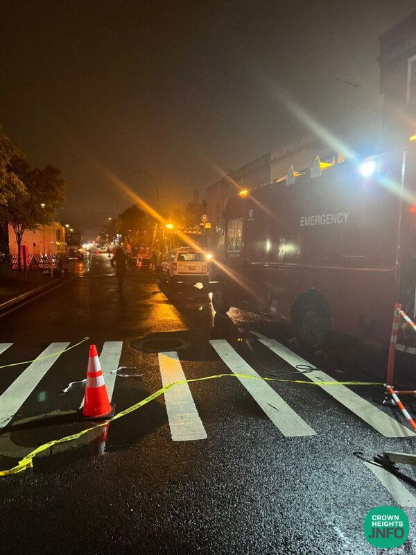As of 11:30pm, the two homes that sit next to Empire Shtibel, Empire Stibel itself, and the string of shops to the corner of Brooklyn, all remain without power as the crews intent to continue working into the night.