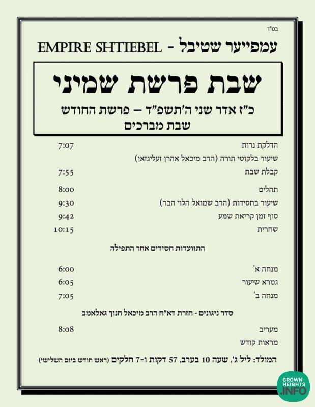 Empire Shtiebel, one of the oldest shul’s in Crown Heights, has daily minyanim from 6am through the whole morning with at least 8 minyanim Shachris daily, as well as multiple minyonim for Mincha & Marriv. In addition, there are several ongoing shiurim during the week and Shabbos.