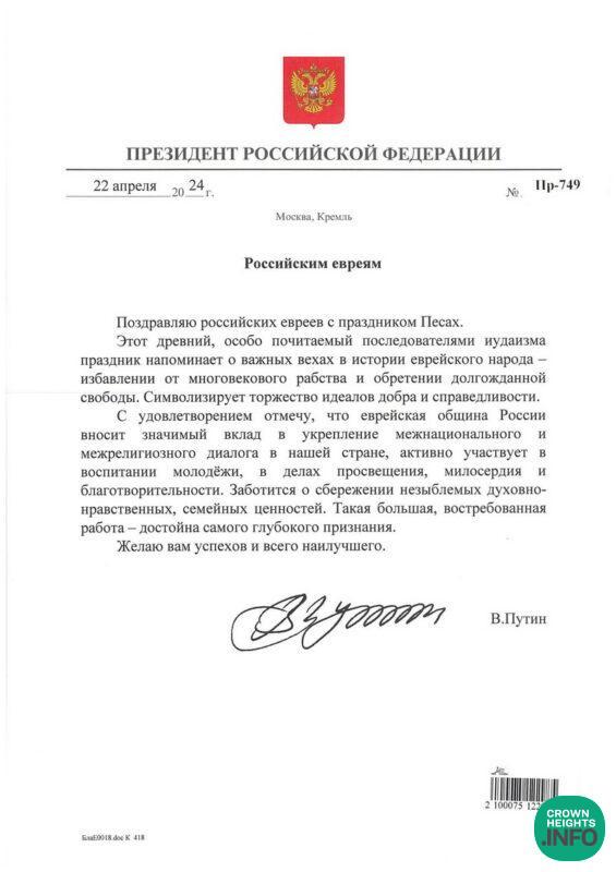 A little while before selling the Chometz of the Russian Jewish people by the Chief Rabbi of Russia, Rabbi Berel Lazar Shalita, the annual blessing letter written by the President of Russia Vladimir Putin to all the Jews of Russia arrived at his office.
