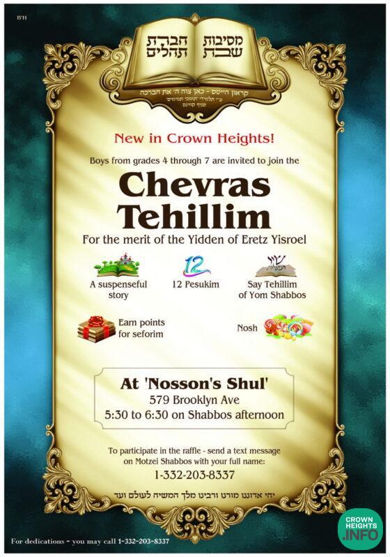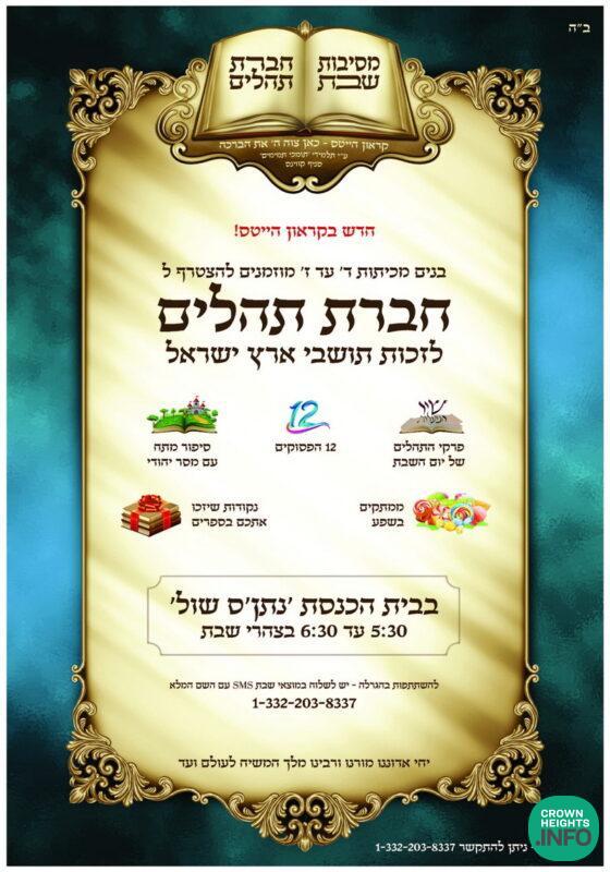 Yes! the real authentic “Chevras Tehilim”, reminiscent of many of our childhood memories. The “Chevras Tehilim” brings together children aged 9-13 (approximately 3rd-7th grade) to melodiously recite the Dovid Hamelech’s Heilige words, and the sing together the entire “Yom Hashabbos”. This heartwarming experience is followed by an engaging story and a delightful snack, all expertly led by the dedicated Shiur Daled students.