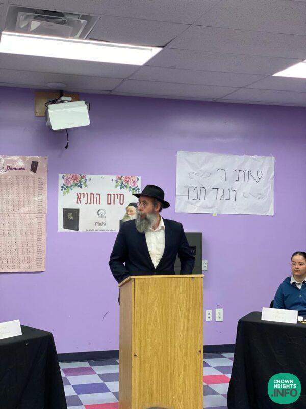 Rabbi Plotkin, the dean of Beis Chaya Mushka, addressed the students at the Siyum, sharing with them the Sicha of the Rebbe that when Moshiach comes, students that have learned Tanya will have the role of teaching it to all those that have not learned it, including great scholars.