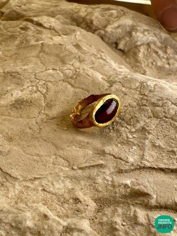 A gold ring set with a red gemstone, approximately 2,300 years old, was discovered in excavations conducted by the Israel Antiquities Authority and Tel Aviv University in the City of David in the Jerusalem Walls National Park, and funded by the Elad Association. This is the second gold ring discovered in less than a year from the same excavation, and from the same period.
