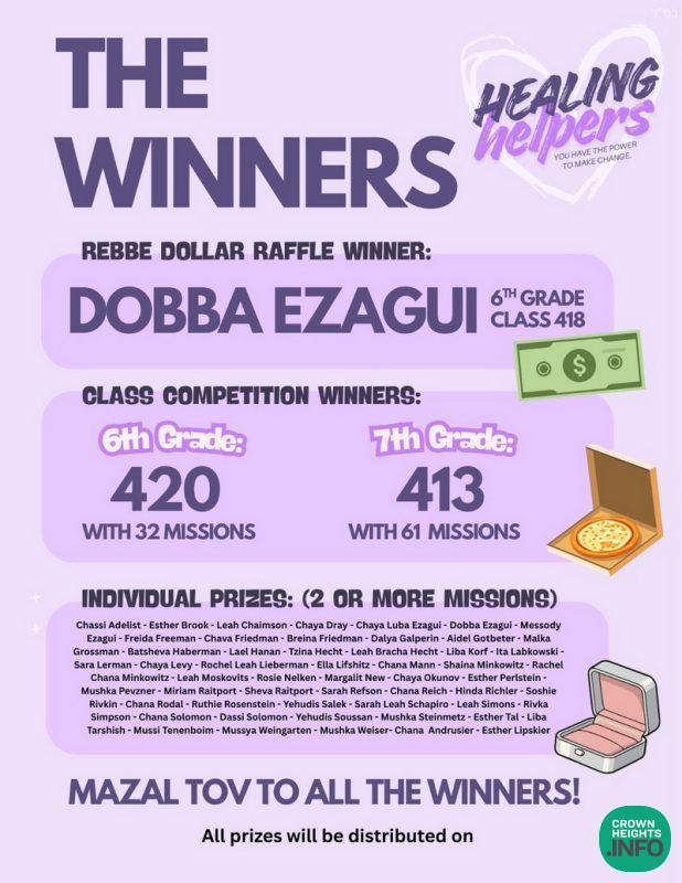 With the wrap up of the challenge, the girls who completed two or more missions received a beautiful personalized jewelry box. At the same time, for each mission completed the girls got one ticket into a raffle for a Rebbe dollar, and the class who completed the most missions in their grade were the winners of a pizza party!