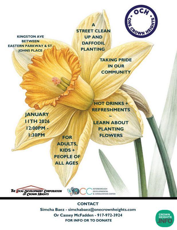 The daffodils were donated by The Daffodil Project, a citywide New York City initiative that plants daffodils across the five boroughs as a living memorial to the victims of September 11th. Each flower planted serves as a lasting tribute to those who were lost. If you would like to organize a similar event or community project, please contact simchabaez@onecrownheights.com.